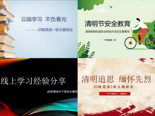 19级俄语一班召开了安全教育主题班会,为学生普及各类安全常识,强化安全意识,提高自我保护能力。20级英语一班以“云端学习,不负春光”为主题召开班会,引导学生在封闭管理期间认真参加线上专业课程的学习,以充实、有益的学习生活战胜疫情的焦虑。(撰稿:李静;终审:杨雅琼)