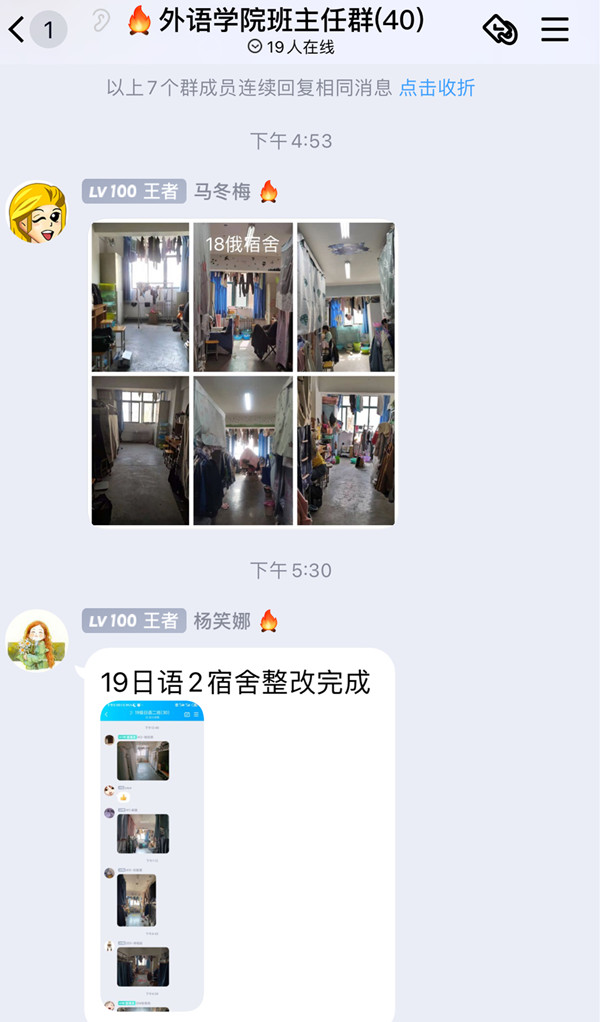 学院实现学生宿舍网格化管理全覆盖,学院领导、辅导员担任宿舍楼层长,形成院领导—辅导员—班主任—班长—宿舍长—联系学生党员分级负责的网点明晰的全覆盖网格化管理。每日通过楼层管理QQ群、班主任群开展宿舍早晚自习打卡、宿舍卫生打卡等活动,积极通过各种方式及时了解与反馈各类学生需求,关注解决学生在非常时期关于学业、心理、就业、生活等方面的困难。通过网格化、党团班构建良好的学生宿舍管理秩序,为学生创建和营造平安、健康、文明、和谐的学生生活环境。(撰稿:杜嘉伟;终审:杨雅琼 )