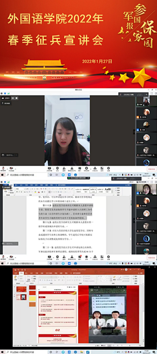 1月27日晚,外国语学院线上组织召开了2022年春季征兵宣讲会,学院党委副书记焦娜、辅导员李静及全体学生参加会议,会议由李静主持。