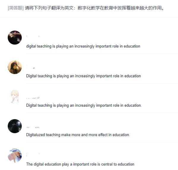 在线上教学的统一授课时间,每个问题最多有七八个学生能够发表自己的看法,而且都要占用所有人的时间去听。例如英语听说教学,大部分同学往往在最开始几次没有得到展示机会后,就失去了表达的意愿,从而失去了练习和用语言表达的机会。在翻译教学中,大多数同学会在翻译中出现的问题,也不一定能从一两位同学的翻译作品中呈现出来,因而无法得到解决。教师通过发布课前保存好的题目,给了每位同学通过这个问题练习语言的机会,每一个同学对于一个问题的反馈和想法都能第一时间展示在教师面前,教师可以将平台中收集的答案统一呈现在屏幕上,也可以将学生提交的文字、语音、图片、视频等文字材料很好地保留在平台中,供学生互相欣赏、评价及反思。学生可以通过对比看到自己的闪光点和不足,互相学习,也会更认真地思考和回答。