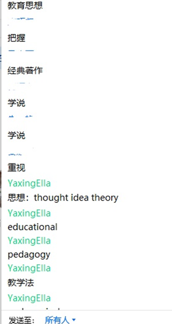 如上所述,学生在线上授课时间内,不仅可以在教师发布的问题内发表自己的见解,还可以通过教学平台的聊天区域随时写出自己对于问题的思考,教师能够捕捉学生的思维以及具有创意的想法,并随时对这些回答给予评价或补充,并将补充的词汇等知识随时写在聊天区内,供学生记录。腾讯会议也可以实现分组讨论功能,教师可以随时加入任意一个小组参与讨论,并帮助学生解决问题。总之,在线教学中对于技术手段的选择,取决于教师要达到怎样的教学目标,最终都要为教学目标而服务。