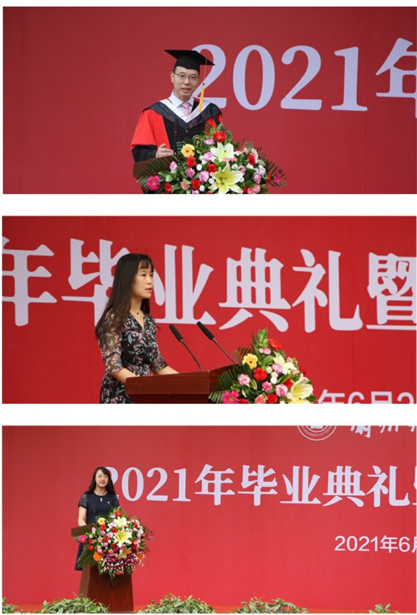学院党委书记杨雅琼、副书记焦娜分别宣读了《兰州理工大学关于表彰2021届优秀毕业生的决定》及《外国语学院关于表彰奖励就业先进集体的决定》,院领导为优秀毕业生及就业先进集体颁发了荣誉证书。副院长冶文玲为各班级校友联络员颁发聘书,希望校友联络员及时传递母校信息,积极联络校友感情,为学校下一个百年事业发展提供更好的校友资源。授予仪式上,毕业生代表王镤震做了发言,表达了他们对母校的由衷感激和不舍之情,离别之际为母校送上了最真挚的祝福。他结合自身经历告诫同学们要注重专业知识的学习和专业能力的提升,要踏实勤奋、敬业努力,内心强大,贵在坚持,积极改变,打开格局、开拓眼界。