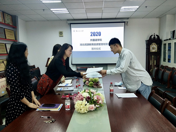 9月1日,外国语学院与湖北词源教育投资管理有限公司共建就业实习基地签约授牌仪式在兰工坪校区综合楼六楼试听会议室举行。学院党委副书记焦娜、日语系主任王霜、就业辅导员杨朵儿、湖北词源教育校招负责人吴天宇参加此次签约授牌仪式并进行座谈交流。