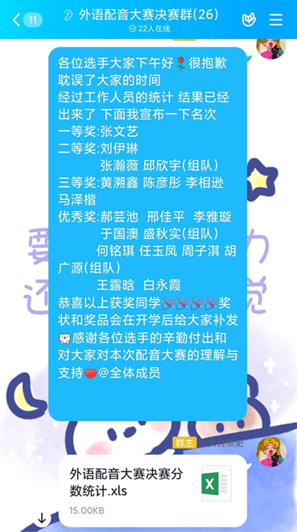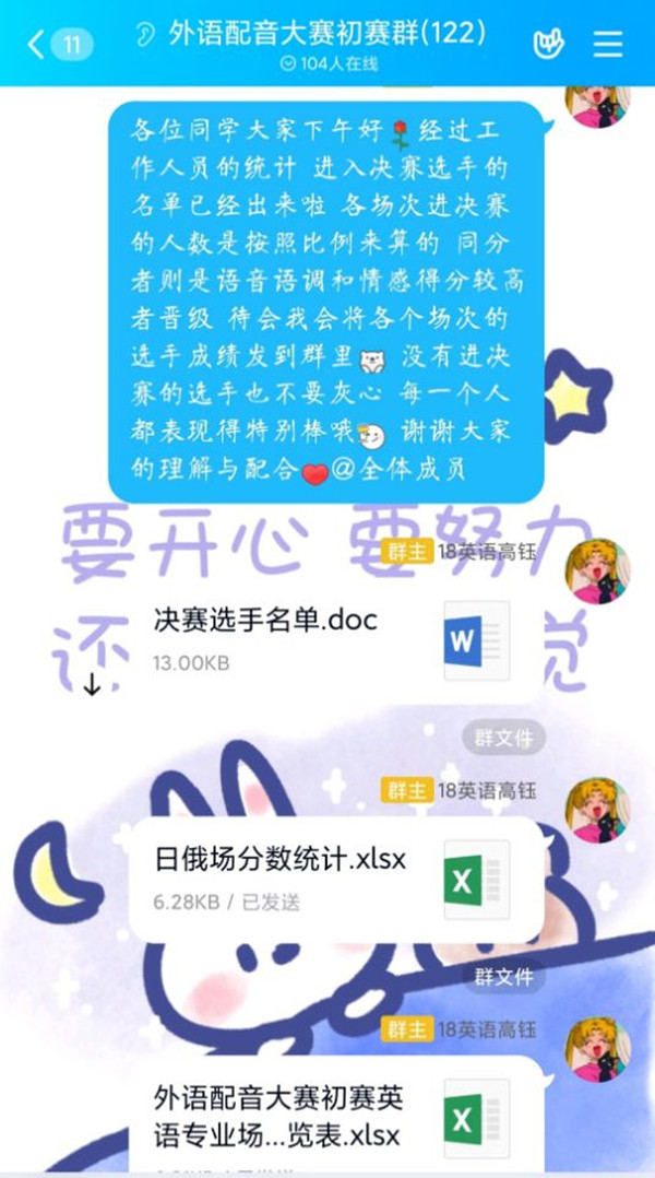 此次配音大赛分为初赛和决赛两个阶段,受疫情影响,本次配音大赛的初赛与决赛均采取线上形式开展。初赛分为英语专业场、日语场和非英语专业场三个场次,共有来自11个不同学院,不同专业的97名同学参加。选手们赛前积极认真准备,从网上寻找最适合自己的配音片段或选择由主办方提供的配音片段,参赛选手们将配音作品提交给工作人员,后由评委老师进行评选打分,工作人员及时在线上公布选手们的分数,保证了比赛的公平公正。经过激烈的角逐,共有14名选手进入决赛。决赛过程紧张激烈、选手们各个实力非凡。最后,来自外国语学院的张文艺同学,凭借其配音作品《艾玛沃森演讲》中良好的语音语调,充沛的情感夺得了本次配音大赛的一等奖。