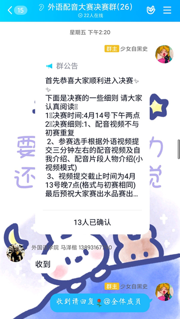 此次外语配音大赛的成功举办不仅让同学们在家也体会到了丰富多彩的校园生活,并且寓学于乐,调动了同学们的学习积极性,提高了学习质量,拓展了同学们的专业兴趣。参赛同学纷纷表示在此次外语配音大赛中获益良多,通过参与比赛不仅学习到了外语知识,还借此机会了解到了一些优秀的外国影视作品,拓展了视野。