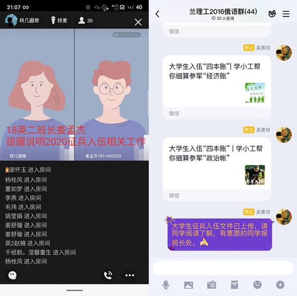 班会上,各班班主任详细了解了班级同学在疫情期间的情况,传达了当前疫情形势,强调了疫情期间线上教学的纪律,介绍了疫情期间心理援助的相关途径以及参军入伍相关政策,鼓励大学生积极参军入伍,保家卫国添荣光,同时毕业班班主任鼓励毕业生以积极的心态去面对疫情带来的变化,积极参与空中宣讲会、线上招聘,在家合理的安排好自己的学习、生活和体育锻炼、按部就班进行论文写作。