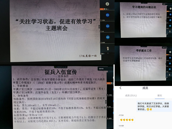 近日来,新型冠状病毒肺炎疫情形势依然严峻,防控工作仍是首位。为深入贯彻落实学院关于打赢疫情防控阻击战工作要求,加强学生思想政治教育,教育引导学生以高度的责任心和强烈的使命感增强抗击疫情的信心,用实际行动助力疫情防控,清明假期前夕,外国语学院全体学生班主任利用钉钉、腾讯会议室、微信等网络平台,面向全院21个班级的五百余名学生,召开了有关疫情期间学生的思想动态,心理问题,学习,就业,论文,征兵宣传等特殊时期线上主题班会。