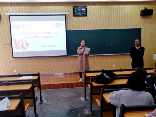2019年10月22日下午,外国语学院邀请张永义教授为2019级全体新生在兰工坪校区1号楼南403教室成功举办了一场主题为“弘扬工大红柳精神,不忘初心追逐梦想”的别开生面的励志报告会。