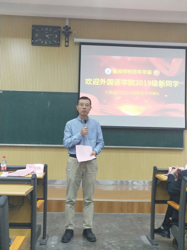9月12日下午,外国语学院2019级全体师生齐聚兰工坪校区1号南楼401教室,举行了“兰州理工大学外国语学院2019级新生开学典礼”。学院院长任育新、副院长韩立俊、党委副书记焦娜、俄语系主任李亚林、英语系主任庞茜之、日语系主任王霜、19级各班班主任、辅导员和2019级全体新生参加了此次典礼。本次典礼由学院党委副书记焦娜主持。