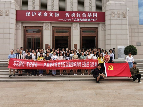 为庆祝中国共产党建党98周年,深入学习贯彻习近平新时代中国特色社会主义思想,结合“不忘初心、牢记使命”主题教育的开展,充分发挥学院各师生党支部战斗堡垒作用,凝聚党员力量,外国语学院党委于7月5日下午在甘肃省博物馆开展革命传统教育活动,参观“红色甘肃——走向1949”展览,重温入党誓词,并观看电影《周恩来回延安》。学院党委委员、教师及学生党支部党员代表参加。