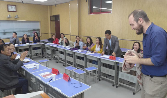 活动期间,外国语学院两位外籍教师Benjamin Hesse和Nathaniel Hunter分别为两校师生做了精彩的讲座。Benjamin Hesse老师主要对美国的人文地理、美食、建筑等进行了介绍,就英语学习方法与学生进行互动交流,并为两校师生献上了精彩的电吉他演奏。他强调学习英语唯有不断地听、讲、练,才能形成牢固的记忆。Nathaniel Hunter老师围绕美国教育体系、中学教学理念、教学方法展开讲解,倡导多元智能教学,他以使用祈使句指示方向、以押韵为切入点进行语音教学为案例做了示范教学,与两校英语教师进行了游戏互动和交流。其新颖的教学设计、愉快的教学氛围赢得了两校教师的掌声。