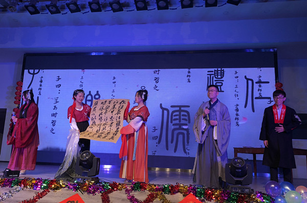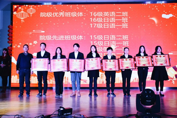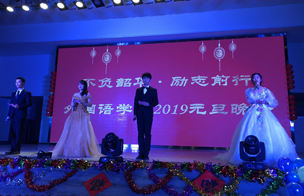 外国语学院元旦晚会以“不负韶华 励志前行”为主题,共分为四幕:“青春岁月”、“岁月如歌”、“长歌逐梦”、“执梦远航 共创辉煌”,以视频与现场演出相结合的方式回顾了学院一年以来的努力、收获、感慨和希望,晚会凝心聚力,为辛勤工作的老师和孜孜以求的同学们带来了新年最诚挚的祝愿。2019外国语学院全院师生将牢记使命,砥砺前行。