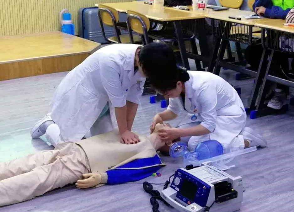 首先兰州市第一人民医院重症医学科杨丽老师进行了急救理论知识授课。杨丽老师就2015版心肺复苏指南中如何判断病人意识、如何拨打120、如何进行胸外按压、如何开放气道、如何判断复苏等问题进行了深入浅出的讲解,让同学们在学习急救知识的同时深刻领会到“时间就是生命”的意义。接着兰州市第一人民医院重症医学科青年志愿者进行模拟单人徒手心肺复苏术分解动作进行展示。随后又进行了现场示范单人心肺复苏术连贯动作的示教,在观摩的同时,也带着同学们复习知识点、按压的深度、频率、按压的位置等,同学们热情高涨,全身心投入,牢牢地记住了心肺复苏的几个关键。实践出真知,为了让同学们更好地掌握和了解急救知识,老师们还指导同学们现场体验,通过参与使同学们正确掌握急救操作规范。