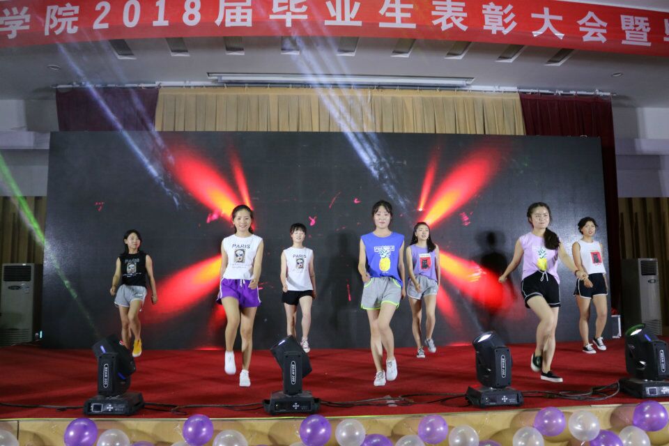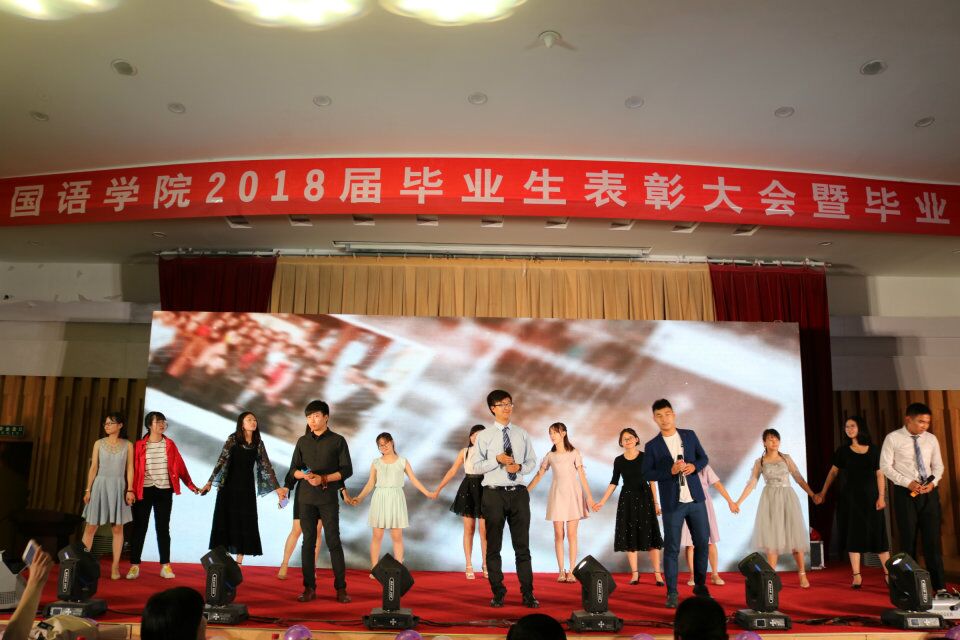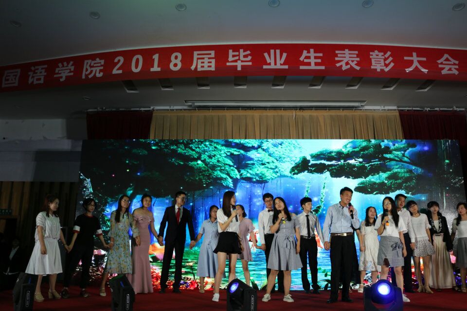 毕业表彰大会结束后,大屏幕出现了记录同学们从入学到毕业的不同片段,他们校园生活的点点滴滴通过视频的方式一一呈现,所有大学的青春记忆和对未来的美好憧憬、所有不舍与学院全体师生对毕业生的殷切期望与祝福,在此时不断触碰着每一位毕业生的心灵。毕业晚会上14级日语二班毕业生合唱的《那些花儿》展现同学们眷念母校,挂念师长的浓厚情谊,《青春记忆》更是把在座的毕业生带回了曾经的青涩时光,而舞蹈《夏日狂欢》、《炫彩夏日》又重新把所有人带回了紧张的离校时间……专业老师、辅导员与18届全体毕业生带来大合唱《青春不散场》将晚会推向了高潮,师生合唱、同窗对唱,使毕业生沉浸在这段难舍难分的情义里,时而哽咽,时而欢笑。