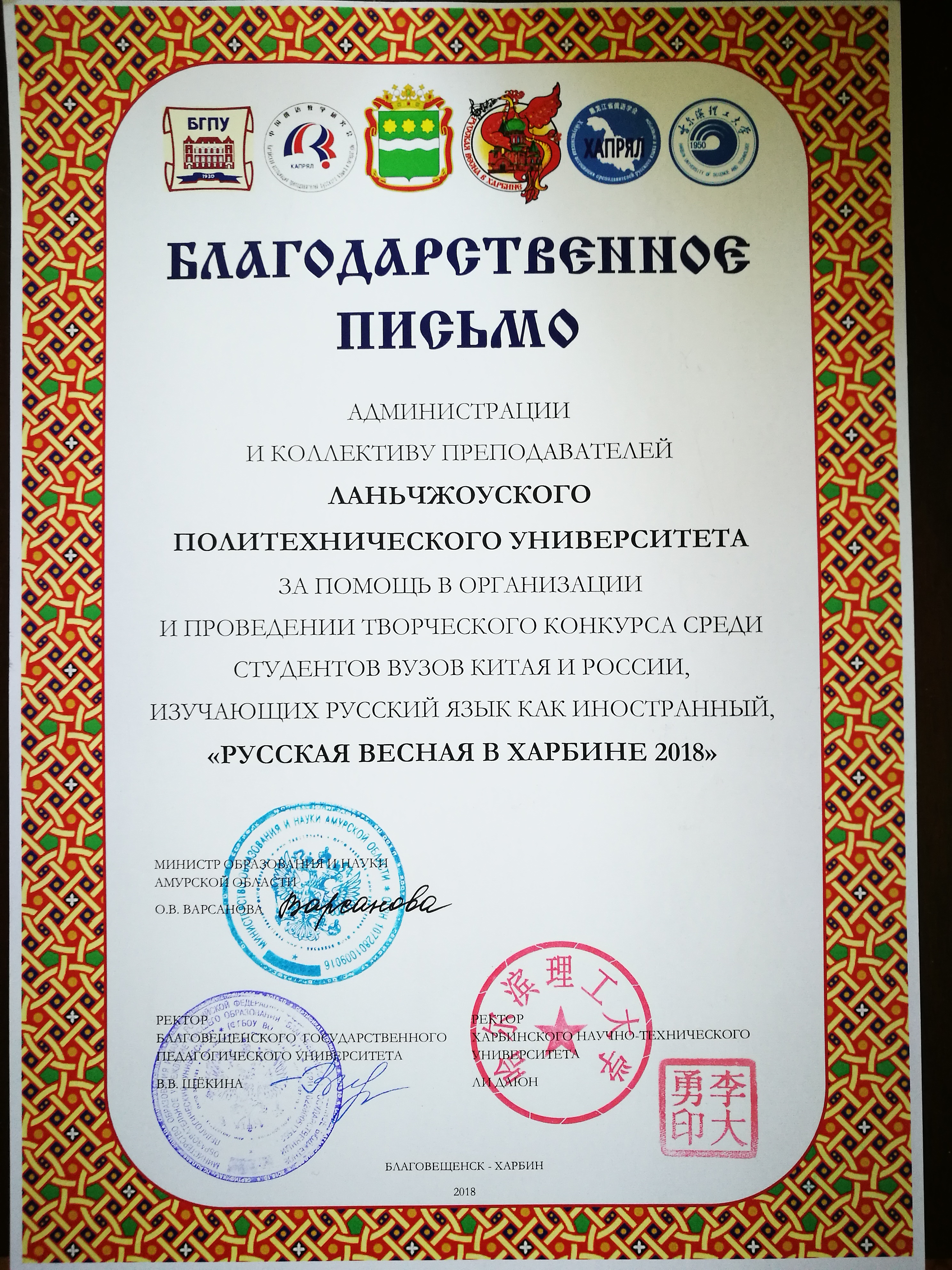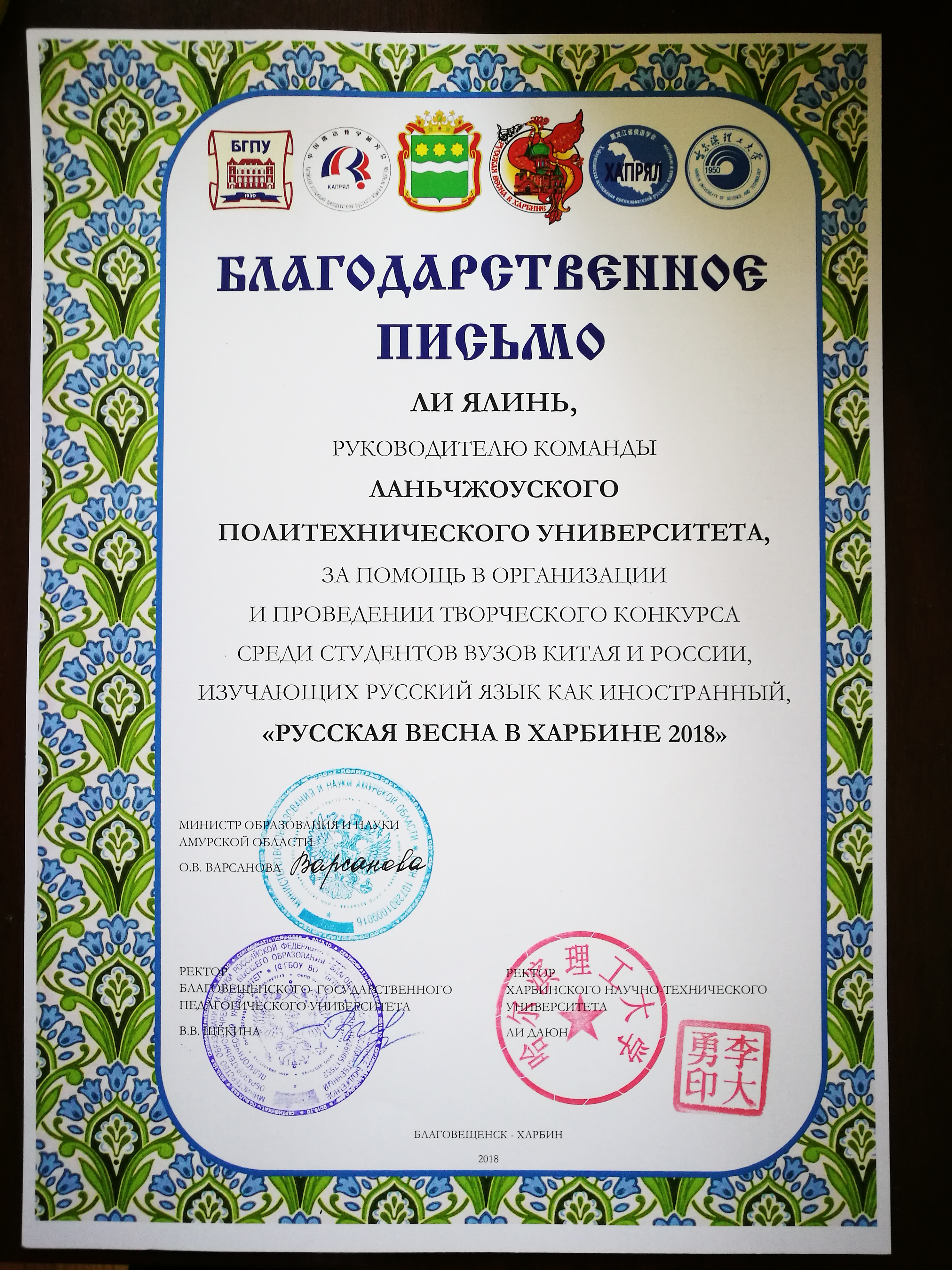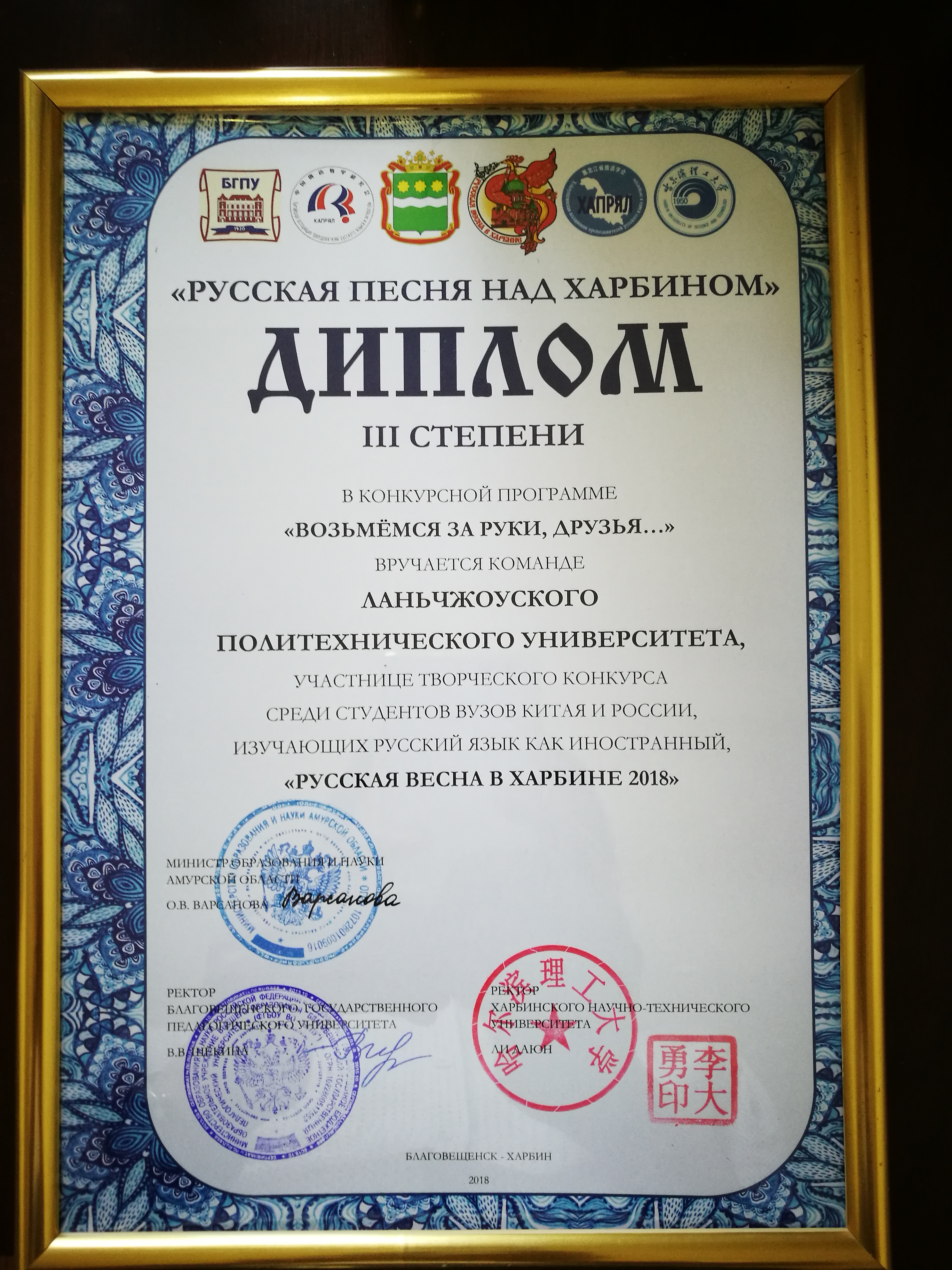 本次竞赛包括俄语朗诵、俄罗斯歌曲、俄罗斯戏剧、俄罗斯舞蹈四个单元。我校代表队由外国语学院2017级俄语班5名同学组成:韩佳秀—俄罗斯歌曲«Улетай на крыльях ветра» (随风飞翔吧)、周生莲+韩佳秀(吟唱)—经典诗歌朗诵«Мне нравится,что вы больны не мной»(我喜欢—你不是为我而相思)、周生莲、李遇、马明芬、董菁菁—俄罗斯民族舞蹈«Варенька»(万尼卡)和5人角色文学作品自创戏剧(«Русский характер»(俄罗斯性格)。经过3天的激烈比赛,最终,我校获得俄罗斯歌曲演唱项目三等奖(一等奖大连外国语大学和哈尔滨理工大学、二等奖辽宁师范大学和哈尔滨师范大学、三等奖兰州理工大学和布拉戈维申斯克国立师范大学),5名学生获得俄罗斯阿穆尔州教育科学部和主办方颁发的«Сертификат»(参赛证书),学校获得组织单位«Благодарственное письмо»(致谢函(奖)),李亚林、吴素珍两位老师获得指导教师«Благодарственное письмо»。