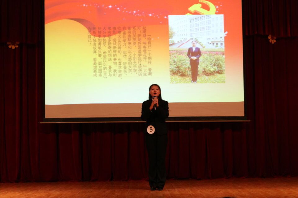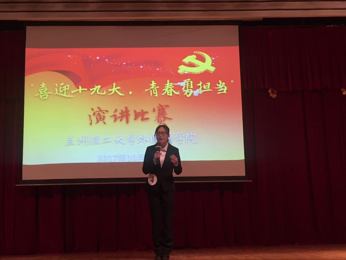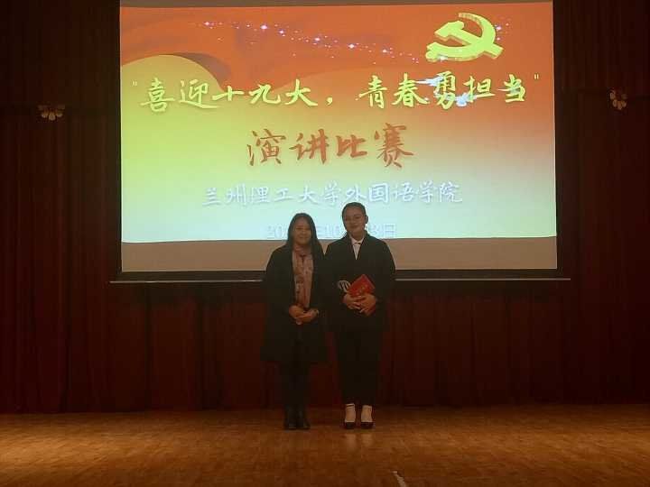月23日晚19:30, 兰州理工大学外国语学院“喜迎十九大 青春勇担当”演讲比赛决赛在本部大学生活动中心四楼礼堂举行。校团委党渭平书记、红柳传媒中心指导老师成晨、校学生会副主席王卓、外国语学院团委书记毛春芳,学生会主席古玥以及辅导员、班主任代表、各班团支部党员、团员青年代表300余人参加了此次比赛。