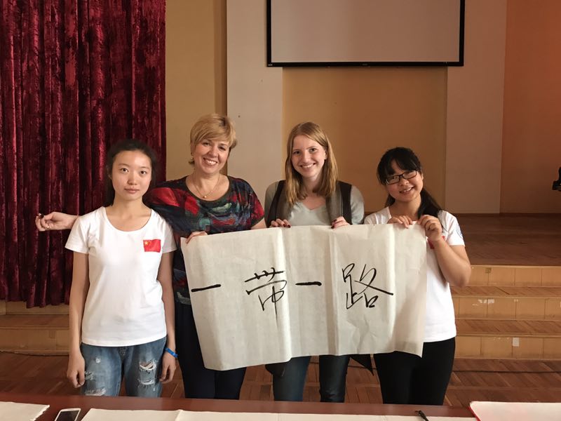 伴着幽静舒缓的古琴乐曲,团队成员身着汉服现场讲授品茶、冲泡方法以及茶具品鉴等茶知识,演示摆具、赏茶、温杯洁具、投茶、洗茶、泡茶、分茶、敬茶品茗等整个茶艺过程,在国立水文大学师生对中华茶文化有了初步了解后邀请其进行不同种类茶叶的冲泡品尝,体验领略中国茶文化的博大精深。一位参与体验的老师说:“我以前只听说过中国茶道,今天第一次亲眼目睹、亲手尝试,真的很有意思,我很喜欢!”一位冲泡品尝了大红袍的学生羞涩地说道:“茶叶真的很香,很好闻,喝到嘴里有点苦涩,很奇特的味觉感受。”随后,两位同学一展书法技能,方案之间、挥斥方遒,通过介绍中国书法“文房四宝”并讲解、演示如何执笔、运笔等使现场师生懂得了基本姿势以及书写要领,在观看两位同学现场书写时,俄罗斯国立水文大学师生神情专注,表现出极大兴趣,个个跃跃欲试,体验环节争相上台,一边揣摩、一边细致地书写着每个笔画,在两位同学的悉心指导下,成功完成了“中俄友好”、“一带一路”等作品,其中书写“一带一路”的老师在活动结束后专门留下与我们沟通,希望能够把“一带一路”这幅字留给她,她要好好珍藏,令团队成员非常感动。