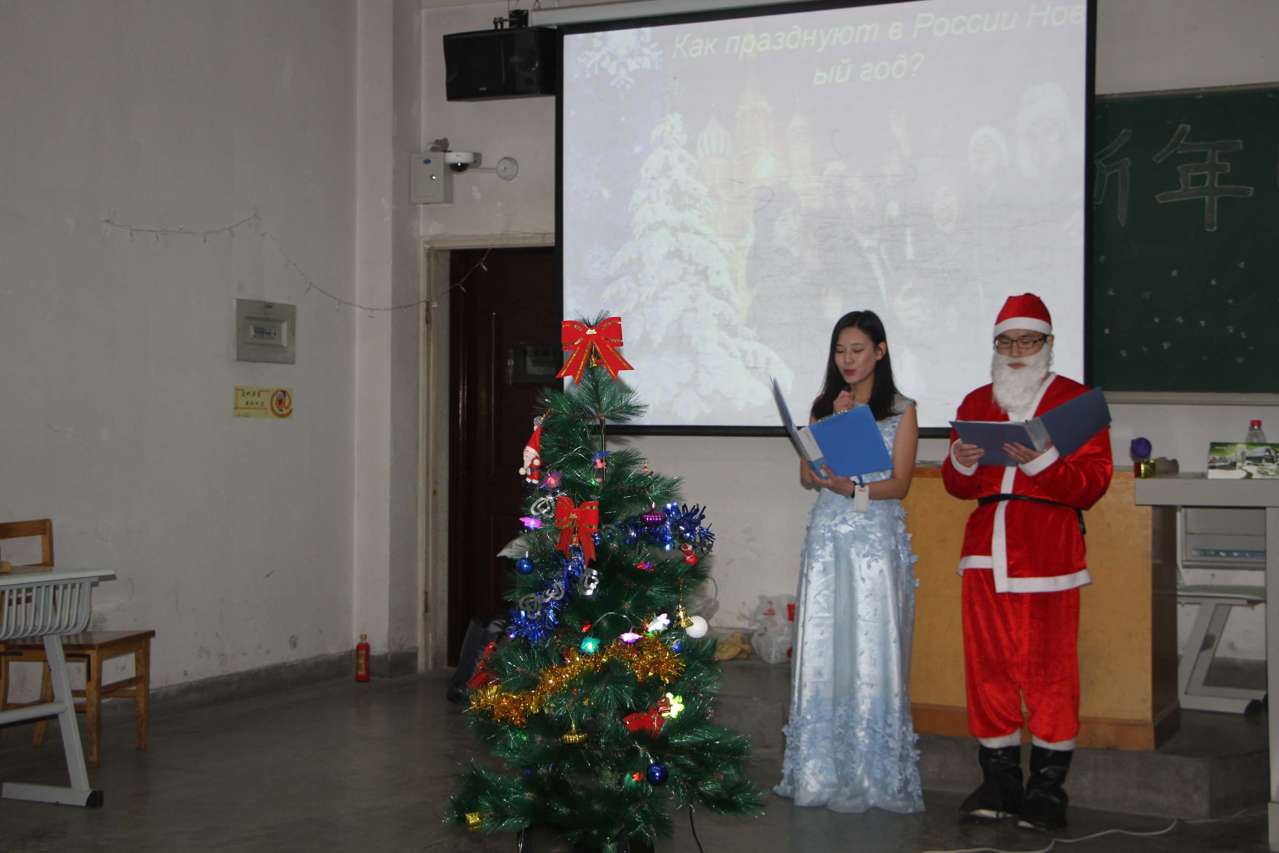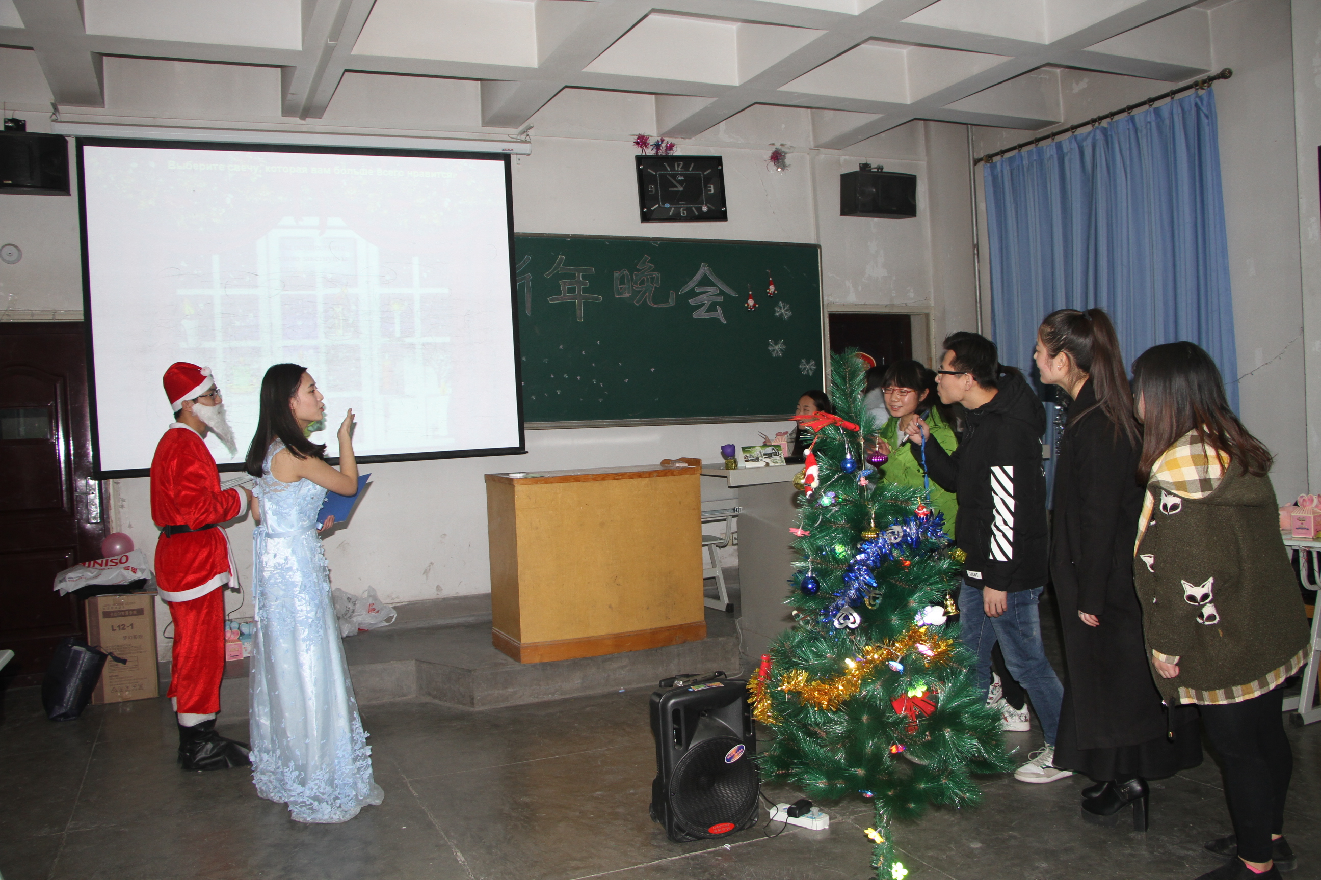 晚会之始,任育新院长致新年贺词,他讲到:在同样的教室,举办同样主题的新年晚会,由一年又一年;俄语专业从一个班到两个班,见证了俄语系的发展,同时也希望俄语系的师生能够将这个课外学习延续下去,做优秀的工大人。