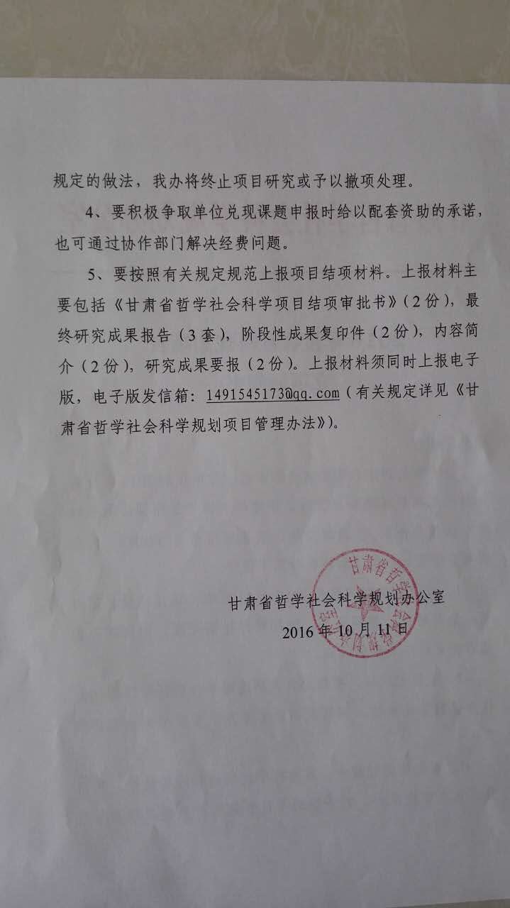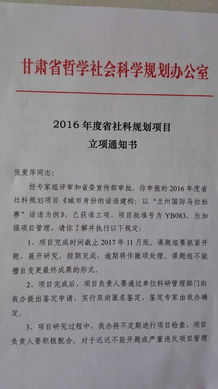 近日,甘肃省哲学社会科学规划办公室下发了《2016年度省社科规划项目立项的通知》,我院有3项课题获准一般项目立项,分别是赵军强副教授主持的《新时期甘肃省民族扶贫政策积极话语分析研究》、张爱萍副教授主持的《城市身份的话语建构:以“兰州国际马拉松赛”话语为例》和李慧老师主持的《跨文化交际视野下甘肃省少数民族文化可持续发展研究》。学院希望三位老师按照相关要求认真开展课题研究。