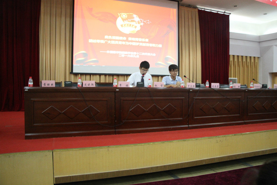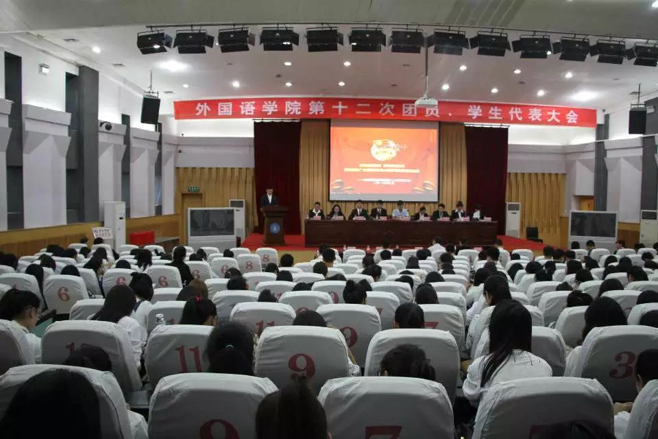 2016年9月13日下午3:30,外国语学院第十二次团员、学生代表大会在本部逸夫科技馆二楼报告厅隆重举行。校团委团委副书记孔德瑞、外国语学院党委副书记张艳老师、校学生会主席崔恒祥同学、兄弟学院团委书记、学生会主席、以及外国语学院团委书记毛春芳老师、十一届主席团成员和全院团学代表、2016级全体新生共计300余人参加本次会议,会议由外国语学院辅导员贾永胜老师主持。