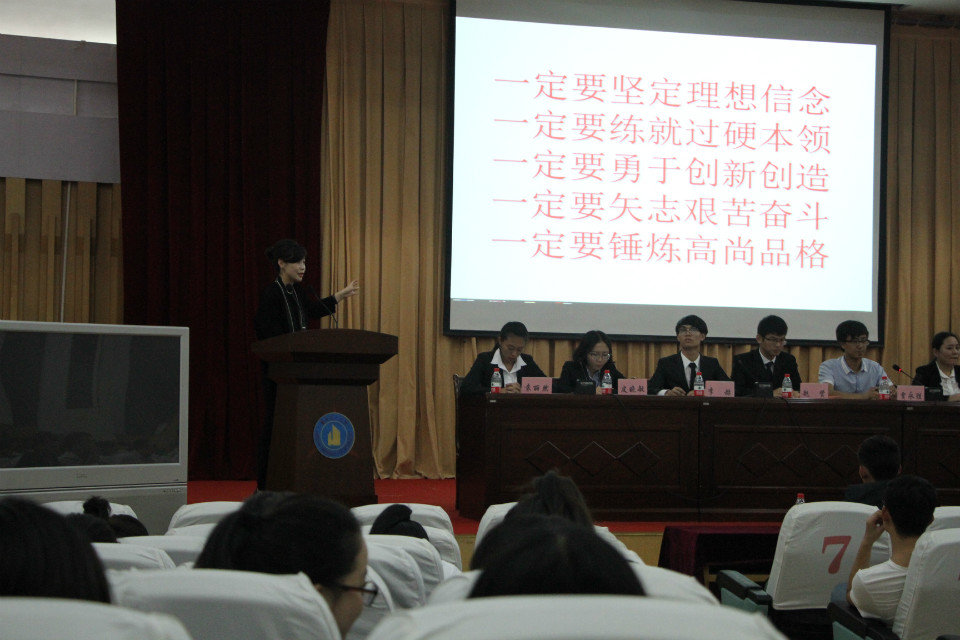 学院党委副书记张艳老师充分肯定了上一届两委会的工作,对新一届两委会提出了新的要求,希望新一届两委会能够继承和发扬红柳精神,助推新发展,再聚正能量,团结一心、奋力向上、牢记责任、立足当下,努力开创我院共青团工作新局面。张书记带领同学们一同回顾了毛泽东同志、邓小平同志、江泽民同志、胡锦涛同志和习近平总书记对青年学子的亲切寄语,阐释了中国道路、中国精神、中国力量对于中国梦的意义,结合新时期国家对青年学子寄予的厚望,呼吁外国语学院全体学子要清晰地认识历史赋予我们的使命,她强调“青年强则国强,青年立则国立”,希望同学们珍惜大学生活,以更加饱满的热情和积极认真的态度投入到学习和工作中,用知识武装自己,让青春在中华民族伟大复兴的征程中焕发出耀眼的光辉。张书记的讲话激昂向上,过程中现场一阵阵热烈的掌声不时响起,表达了同学们对肩负责任的认同,展示出青年学子高举团旗跟党走,奋力实现中国梦的信心与坚定信念。
