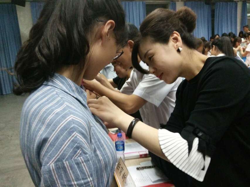 在学院领导为新生佩戴校徽后,现场全体人员共同朗诵《少年中国说》……