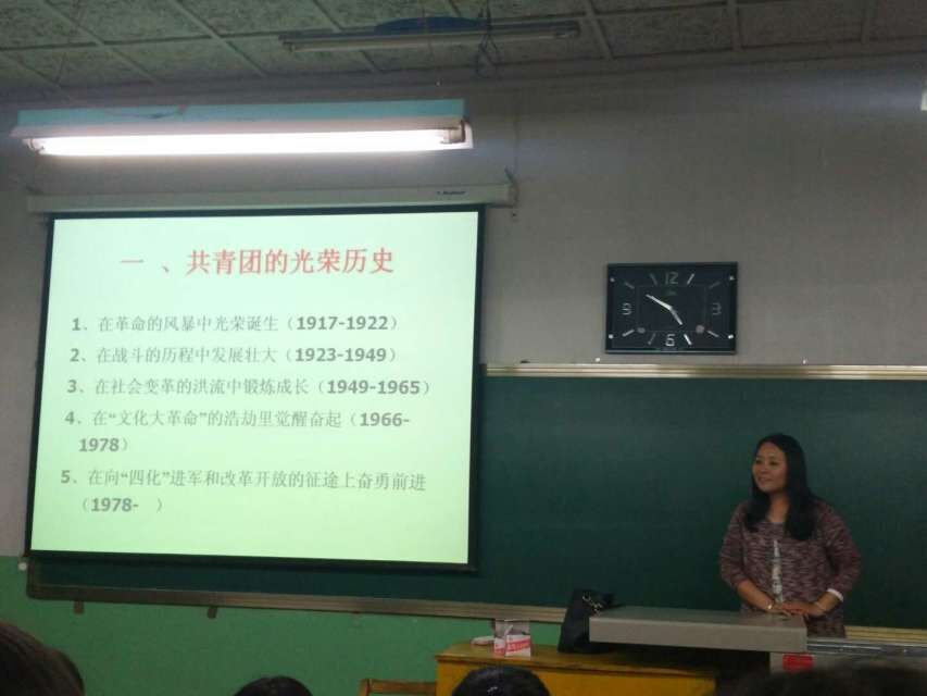 首先毛老师就“什么是青马工程”、“为什么要开展青马工程”以及“团学干部应具备何种素质”等方面,勉励学员通过培训锻炼提高个人综合能力。激励广大学生干部认真学习马克思主义理论,积极践行社会主义核心价值观,鼓励同学们认真聆听,有所收获。随后,毛老师做题为《纪念五四运动 继承发扬优秀传统》专题讲座,为同学们讲解了中国的十四年抗战及其意义、五四精神及中国梦,她希望广大团员青年和全体学生干部追随党的号召,能够牢记国耻、发奋图强、锐意进取,勤奋学习,继承发扬优秀传统,成长为一名合格的大学生,为祖国发展建设做出贡献。