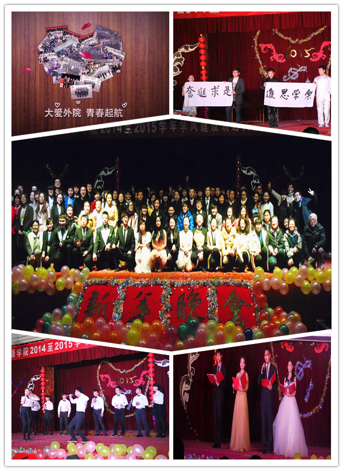 外国语学院元旦晚会以“梦想 奋进 成长 收获”为主题,共分为四幕:“我爱你中国”、“恰同学少年”、“青春纪念册”、“筑梦兰理工”,以视频与现场演出相结合的方式梳理了一年来的努力、收获、感慨和希望,回顾了2014-2015学年学院学风建设一路走来的“青春足迹”,凝心聚力,积极倡导正能量,为辛勤工作的老师和孜孜以求的同学们带来了新年最诚挚的祝愿。