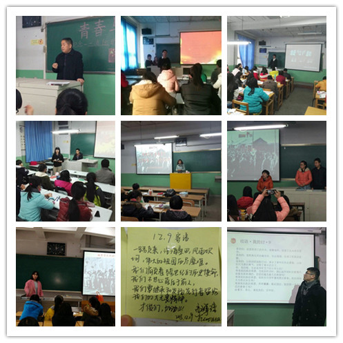 2014级英语2班全体师生一起回顾了那段在中国共产党引领下举行的声势浩大的抗日救国示威游行,使学生深入了解历史真相,通过校团委王正民书记的主题报告和热烈的“共筑中国梦”之讨论,引发学生集体爱国情感;2015级俄语团支部,采取“一二九运动”知识竞赛、“我的中国心”寄语等方式,展示当代大学生的精神风貌和爱国情怀;2013级日语2班,同学们以激情澎湃的爱国主题演讲、激发爱国热情,活动现场同学们积极利用网络平台表达对爱国先烈的热爱之情;2013级英语2班由团支书带领大家重温历史,通过爱国歌曲联唱,使同学们更深刻地体会到先辈们身上那种大无畏的爱国精神;2013级日语2班开展“铭记一二九,共筑中国梦”主题演讲活动,同学们纷纷表示作为祖国的未来,要为祖国的繁荣昌盛而认真学习,风雨同舟,患难与共,愿祖国更加富强;2014级日语2班展示了“一二.九”运动时留下的珍贵图片,使同学们体会到了“复兴和发展中华民族”的使命,增加了努力学习的动力,更让大家明确了自己的报国之志;2014级日语1班由主持人为大家讲解了“一二•九”抗日救亡运动的情景,并进行了《青春的传说》诗歌朗诵,同学们激情澎湃,活动气氛十分活跃;2012级英语2班观看电影《百年情书》,让大家了解了当时大学生挥斥方遒的革命勇气,为国家将个人生死置之度外的大无畏精神,观影后,同学们都纷纷表达了对当时先烈的敬佩,一位同学讲到“其实大家都是一样的,我们每个人都与祖国息息相关,大家纷纷表示作为毕业生要承担起当代大学生的责任,为祖国的发展建设贡献自己的一份力量……