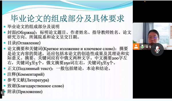 蔺金凤老师还介绍了本科生毕业论文工作管理规定、本科生毕业论文工作规定、本科生毕业论文答辩管理办法、本科生撰写毕业论文要求、本科生毕业论文指导教师职责、毕业论文写作概述与要求。同时介绍俄语系论文指导教师方向,并要求学生要尽快完成论文方向及导师的选择工作。