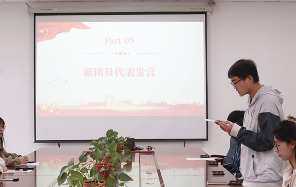 仪式在庄严的国歌声中拉开帷幕,学院团委书记杜嘉伟宣读了2023年新发展团员名单,并为新发展团员佩戴团徽、颁发团员证。全体团员在郭梓轩同学带领下,面向团旗进行庄严宣誓。新发展团员代表姚梓琪、熊子健,老团员代表王语彤、赵红丽,学生党员代表丁宁、程钰筱分别结合入团感想、入团故事、团组织推优入党经历分享心得体会与收获。