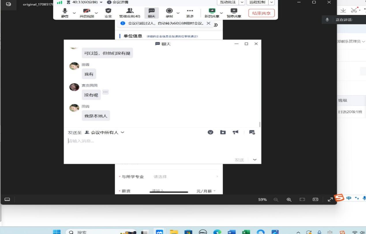 2024年2月21日晚,日语专业2024届毕业生实习、就业动员大会在线上举行。会议由日语专业副主任郑毅乐主持。日语专业主任王霜老师对实习单位的情况进行详细介绍,也再次强调实习安全注意事项。郑毅乐就实习期间学生需要使用的校友邦操作系统对学生进行了培训。之后,王霜从近几年日语专业的就业形势进行分析,动员学生做好人生规划,积极就业,创造自己的人生价值。动员大会最后的提问环节,学生对实习、就业相关的事宜积极提问,部分同学对如何能在实习基地就业非常关注,两位老师进行了认真解答。