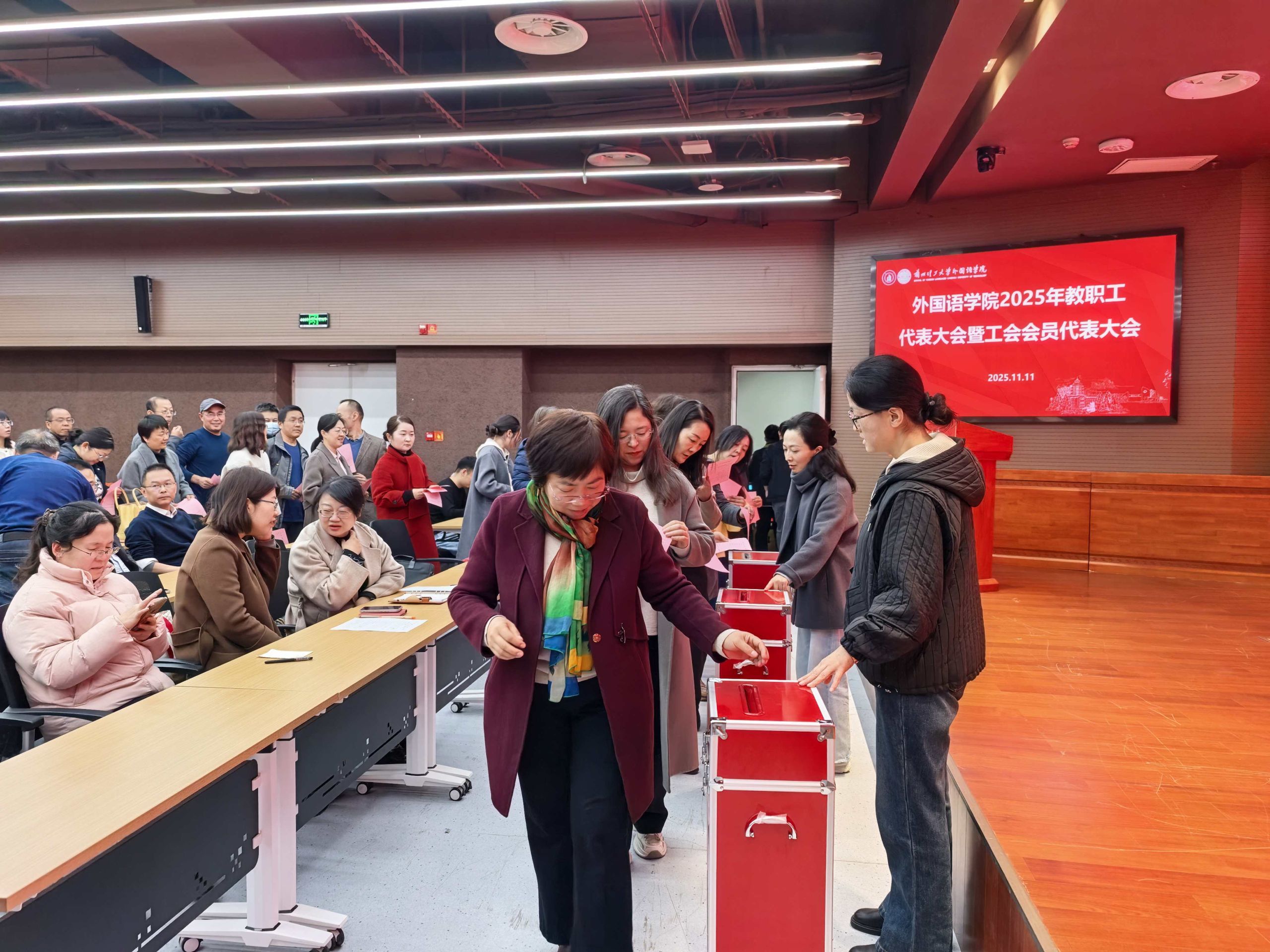 11月11日,外国语学院2025年教职工代表大会暨工会会员代表大会在彭家坪校区问鼎堂109报告厅隆重召开,学院全体教职工代表参加会议。