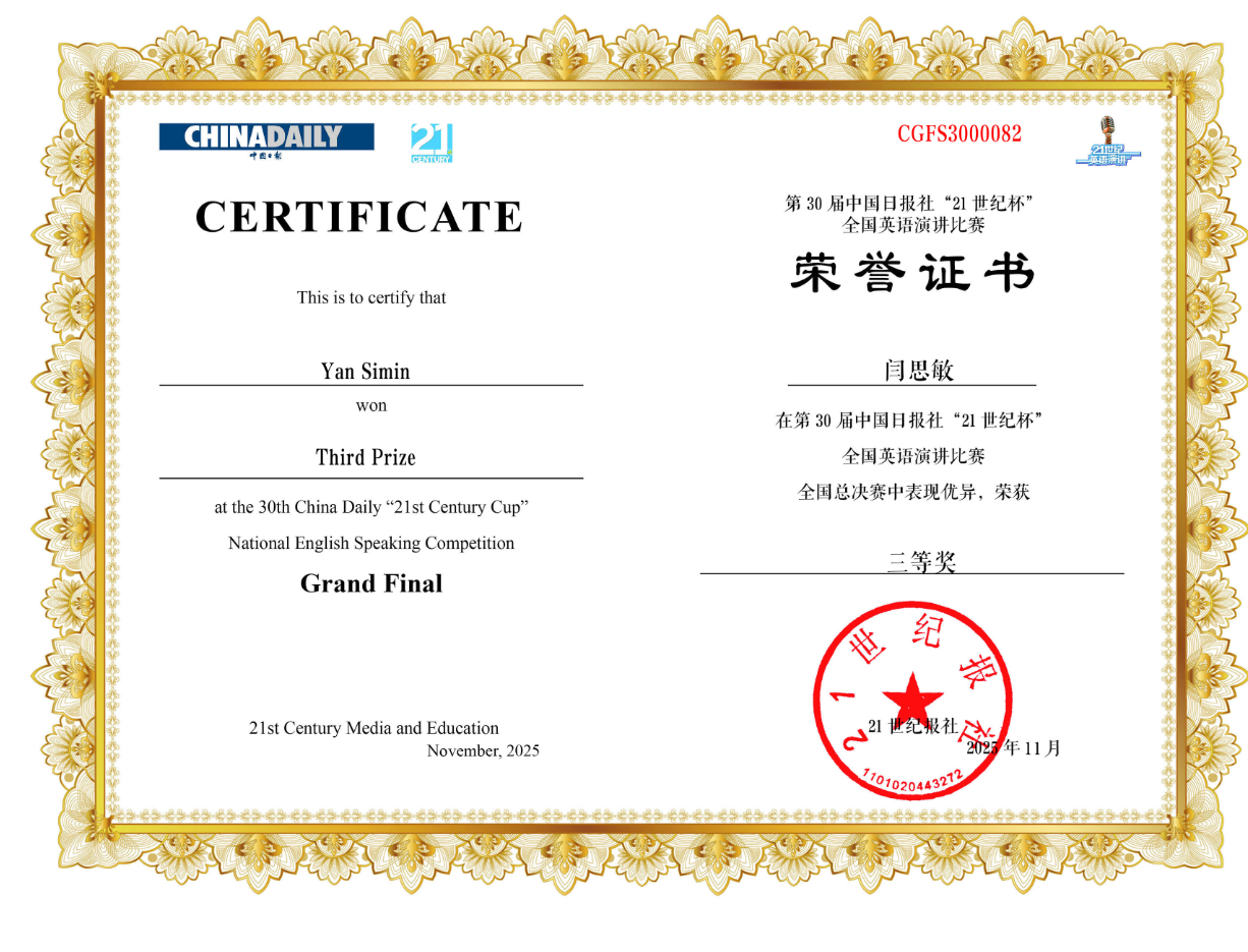 11月13日至17日,第30届中国日报社“21世纪杯”全国英语演讲比赛全国总决赛在杭州举行。作为国内极具影响力的英语演讲赛事,本次比赛汇聚了全国百余所高校的顶尖学子同台竞技,赛程涵盖定题演讲、即兴演讲及问答环节,竞争尤为激烈。